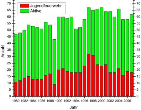 Aktive Mitglieder Was heißt das eigentlich, "aktives" Mitglied zu sein? Alle Mitglieder der Feuerwehr von 16 bis 61 Jahren sind im Normalfall aktiv, das heißt sie haben die Pflicht regelmäßig am Ausbildungsdienst teilzunehmen und selbstverständlich im Einsatzfall - sofern er/sie vor Ort ist - zur Verfügung zu stehen. Ausnahmen gibt es eigentlich nur bei Krankheit. Hieraus ergeben sich zwangsläufig auch die Rechte des Feuerwehrmitgliedes. Nämlich das Recht gegenüber dem Arbeitgeber, die Arbeitsstätte im Einsatzfall jederzeit verlassen zu dürfen. Im Normalfall gibt es hier wenig Probleme, das Verständnis ist fast immer groß, zumal entstehende Unkosten des Arbeitgebers bei der Kommune geltend gemacht werden können. Schwieriger wird es heute jedoch bei der Freistellung zu Ausbildungszwecken. Umso wichtiger ist es, die Bedeutung einer Freiwilligen Feuerwehr immer wieder deutlich zu machen. Nicht zuletzt ein Grund für die Erstellung dieser Seiten. Sie haben Interesse, die Arbeit der Feuerwehr aktiv zu unterstützen? Wir suchen jederzeit interessierte Bürgerinnen und Bürger, die eine abwechslungsreiche ehrenamtliche Aufgabe übernehmen möchten! Melden Sie sich bei uns... Folgende Grafik zeigt die Mitgliederentwicklung der Ortsfeuerwehr Sudweyhe (Stand: 31. Dezember 2007):