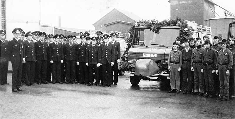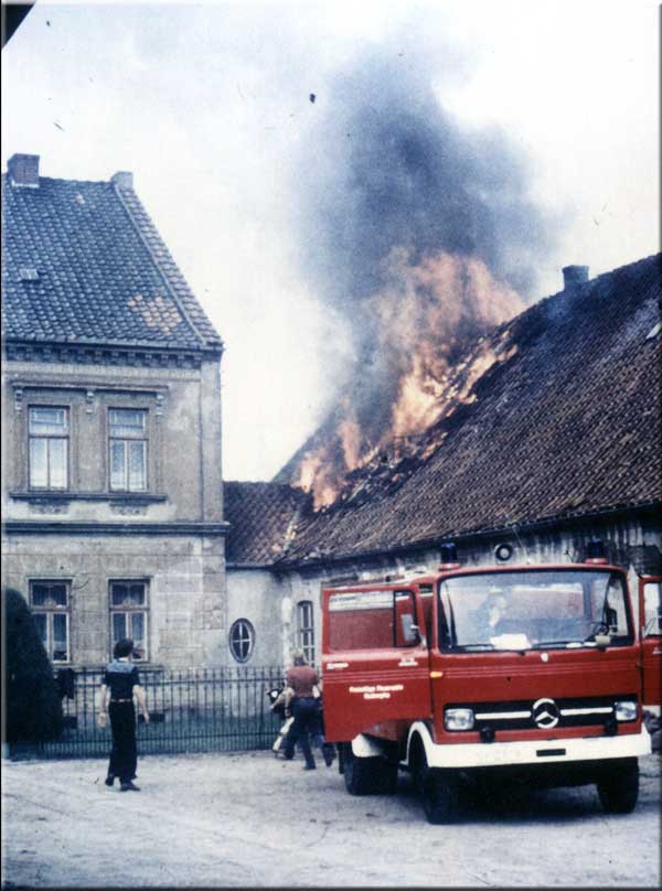 Folgende Aufnahme zeigt das Fahrzeug bei einem Einsatz im Jahr 1976: ein Brand auf dem landwirtschaftlichen Anwesen Esdohr in Sudweyhe. Eine Ausdehnung des Feuers außerhalb des mittleren Gebäudetraktes konnte übrigens dank massiven Einsatzes mehrerer Ortsfeuerwehren verhindert werden. Der Schaden blieb relativ gering!