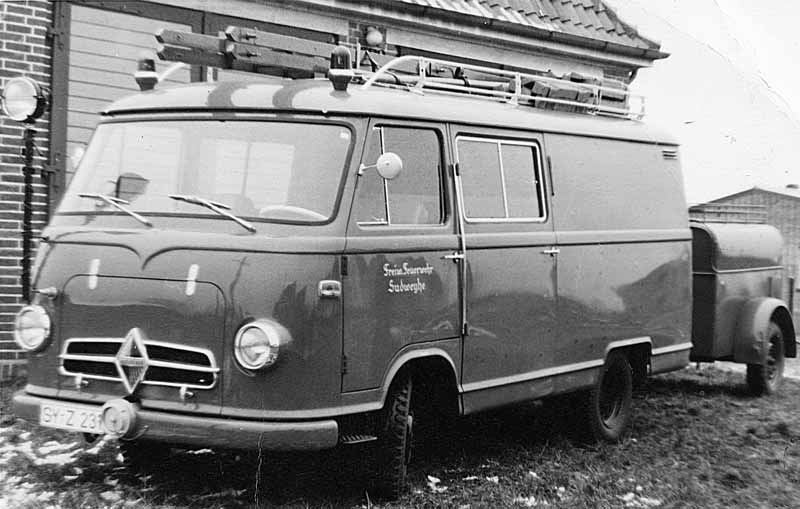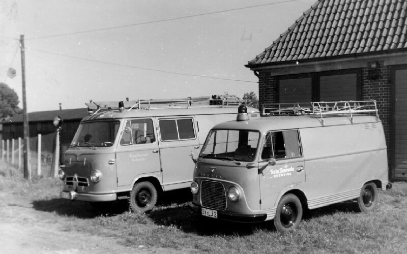 Fahrzeuge in der Feuerwehr sind auch immer ein sehr interessantes Spiegelbild der Ingenieurskunst ihrer Zeit. So ist es kein Wunder, dass auch sehr viele Nichtfeuerwehrleute zu Liebhabern der Feuerwehrfahrzeuge wurden. Auch die Ortsfeuerwehr Sudweyhe hat im Laufe ihrer fast 100jährigen Geschichte manches - aus heutiger Sicht - Unikum besessen. In diesem Abschnitt wird versucht, nach und nach die Fahrzeuge so detailliert als möglich vorzustellen. Folgendes Bild zeigt das LF 8 von Borgward (Baujahr 1960) zusammen mit dem TSF (Ford Transit, Baujahr 1963) vor dem alten Haus der Feuerwehr in der Raiffeisenstraße. Die Aufnahme stammt von 1963. Links hinter den Fahrzeugen steht noch die alte Reithalle des Reitvereins Sudweyhe, jetziger Platz des heutigen Feuerwehrhauses.